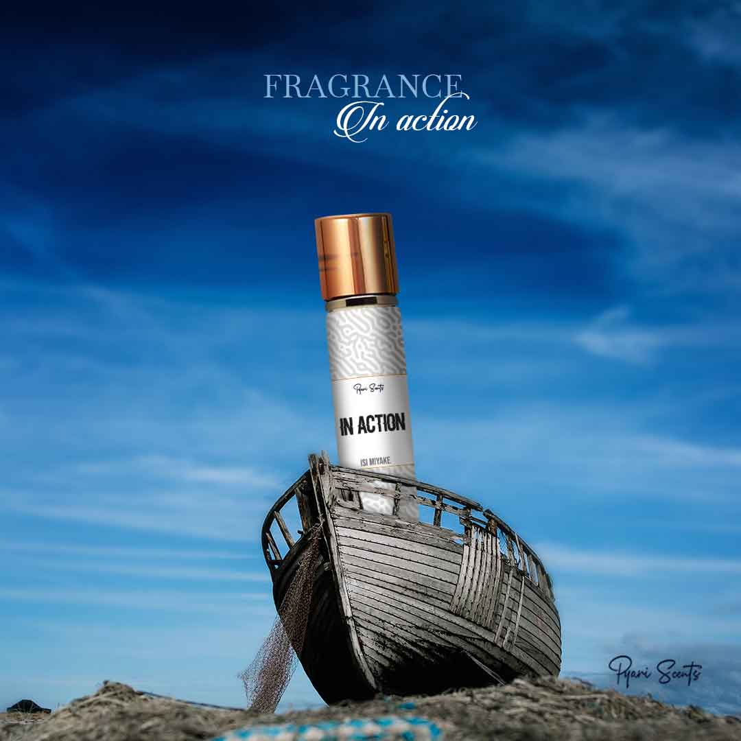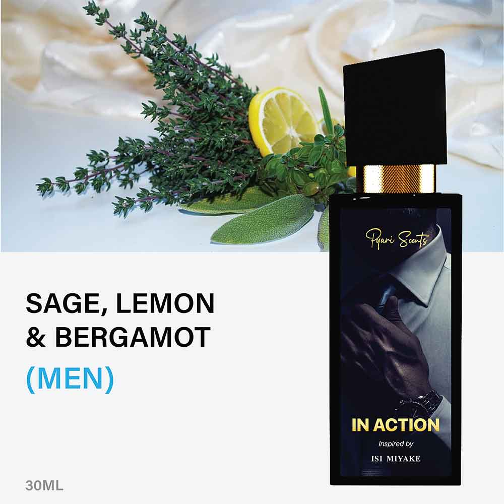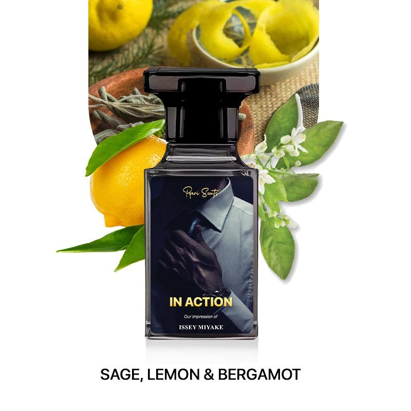 In Action inspired by ISI Miyake. The woody aquatic scent opens with the top notes of fresh lemon, bergamot, yuzu, and tarragon. The composition deepens with the exciting and interesting combination of water lily and nutmeg in the middle notes, offering a spicy and woody fragrance. The base notes reflect a strong hint of an intense, woody scent with tobacco, sandalwood, cedar, vetiver, and musk.